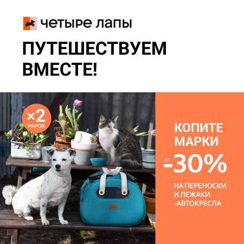 С 15 марта по 31 мая при покупке любых товаров в розничных магазинах Четыре Лапы, мобильном приложении и интернет-магазине вы получаете марки, которые можно обменять на скидку до 30% на товары из категории “Сумки и переноски”: