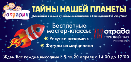 Благодаря специальной технологии Full Dome Vision и изображению в 360 градусов вы попадете в космос и узнаете самые сокровенные тайны планеты. Также Вас ждут тематические мастер-классы: сумасшедшая наука, роспись камней, фигуры из марципана, игрушки из ракушек и космические человечки. И, конечно, подарки всем участникам! Ждем Вас на фуд-корте с 14:00 до 17:00 каждые выходные апреля!