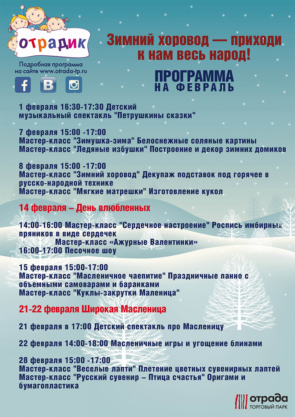 Детский клуб «Отрадик» приглашает Вас на программу мероприятий «ЗИМНИЙ ХОРОВОД – ПРИХОДИ К НАМ ВЕСЬ НАРОД!»