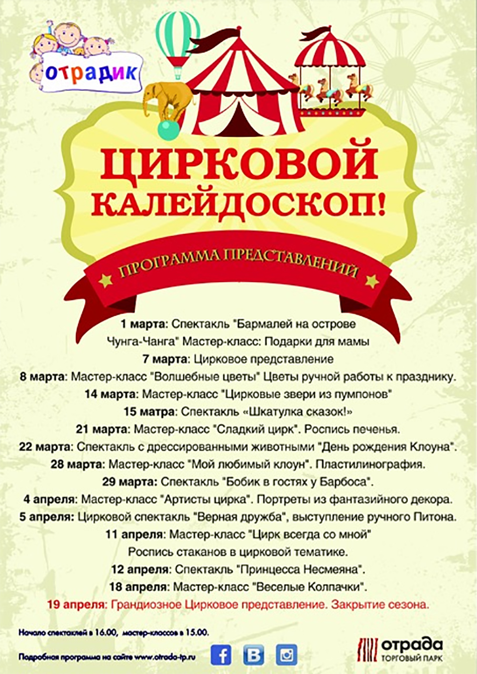 С 1 марта по 18 апреля приглашаем Вас в Детский клуб «Отрадик» на программу «ЦИРКОВОЙ КАЛЕЙДОСКОП»!