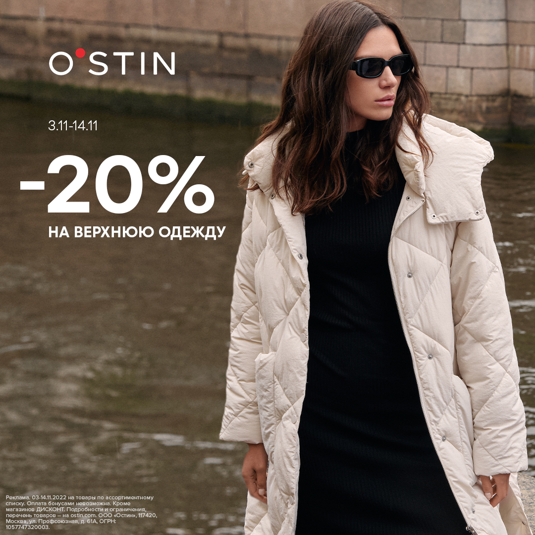 Со скидкой теплее! С 3 по 14 ноября в O'STIN -20% на верхнюю одежду В акции участвует выделенный ассортимент для женщин, мужчин и детей. Выбирайте актуальные модели и экономьте! Подробнее clck.ru/RcoiT