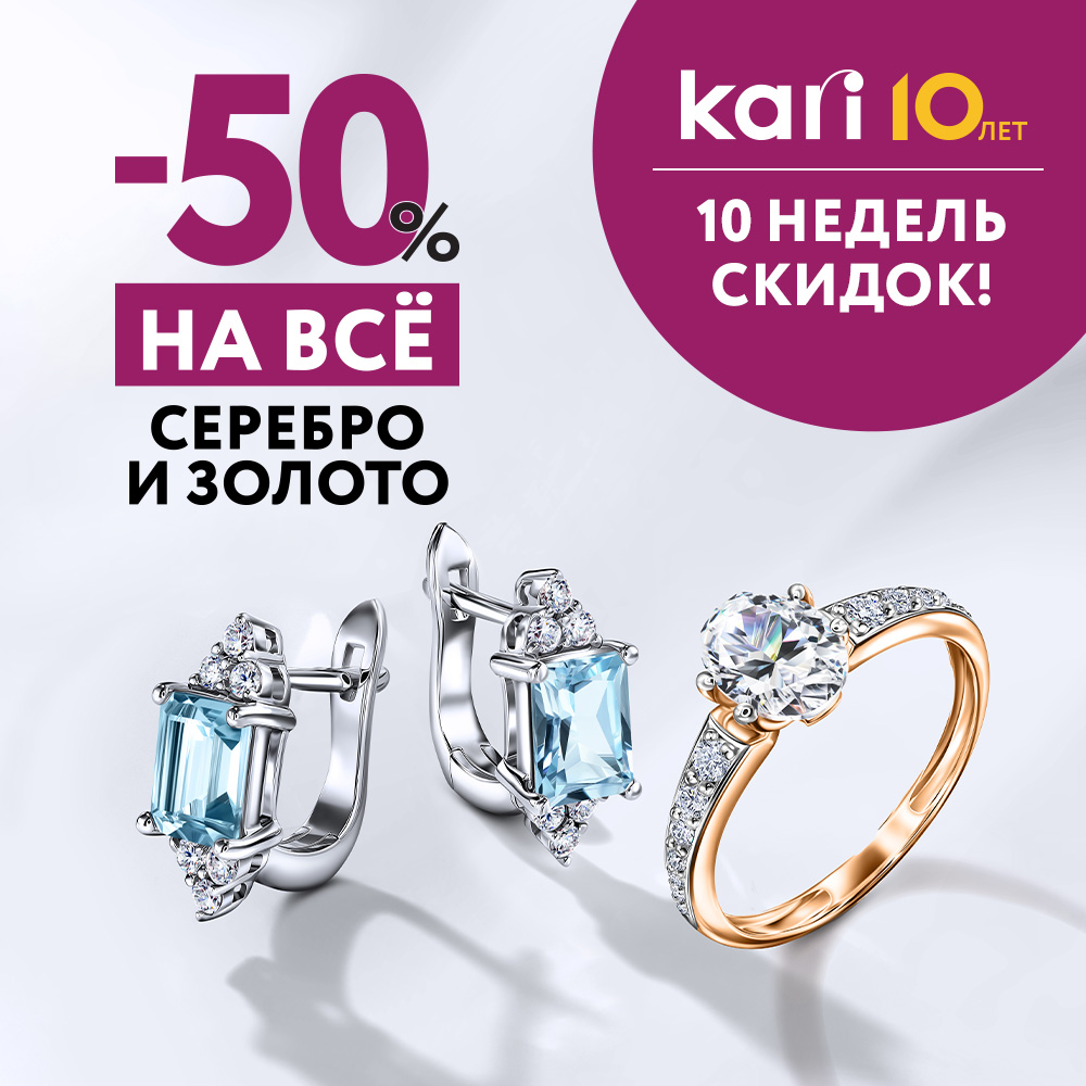 С 7 ноября – неделя «ювелирных скидок» на все украшения KARI jewelry. В ассортименте можно найти классические коллекции с флористическими мотивами, минималистичные и авангардные, в ретро и стиле современных дизайнеров. Скидки на все коллекции серебряных и золотых украшений – 50%. Считайте выгоду и планируйте подарки заранее! 10 лет вместе с KARI!