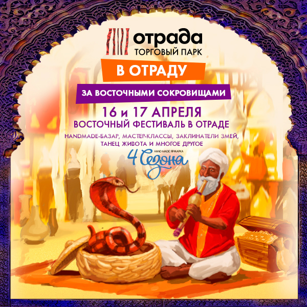На протяжении двух дней в галереях Отрады будет расположена Hand Made ярмарка "4 сезона", где вы сможете ощутить себя купцами эксклюзивных товаров. Также вас ждут мастер-классы по изготовлению восточных украшений и завораживающая фотозона с настоящим удавом. А на центральном входе Торгового парка можно будет прокатиться на верблюде!