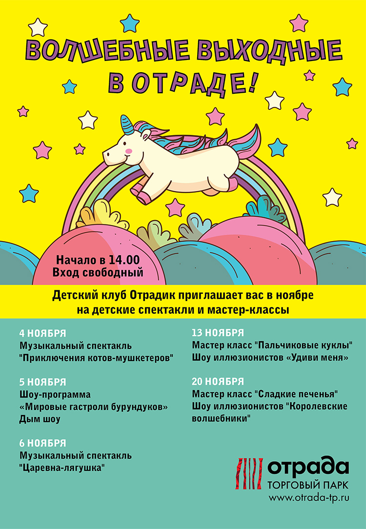 Друзья! Приглашаем вас провести волшебные выходные в детском клубе «Отрадик». В ноябре вас ждут музыкальные спектакли, мастер-классы и шоу фокусников!