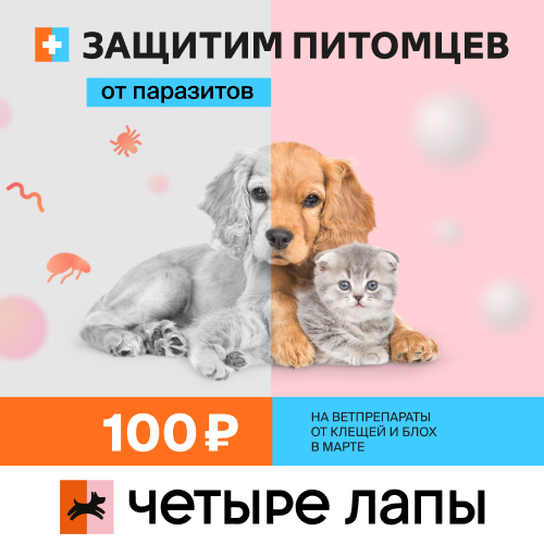 Покупая антигельминтики для питомцев в феврале, вы получаете 100 бонусных рублей на карту Четыре Лапы, которые в марте можете потратить на средства от блох и клещей.